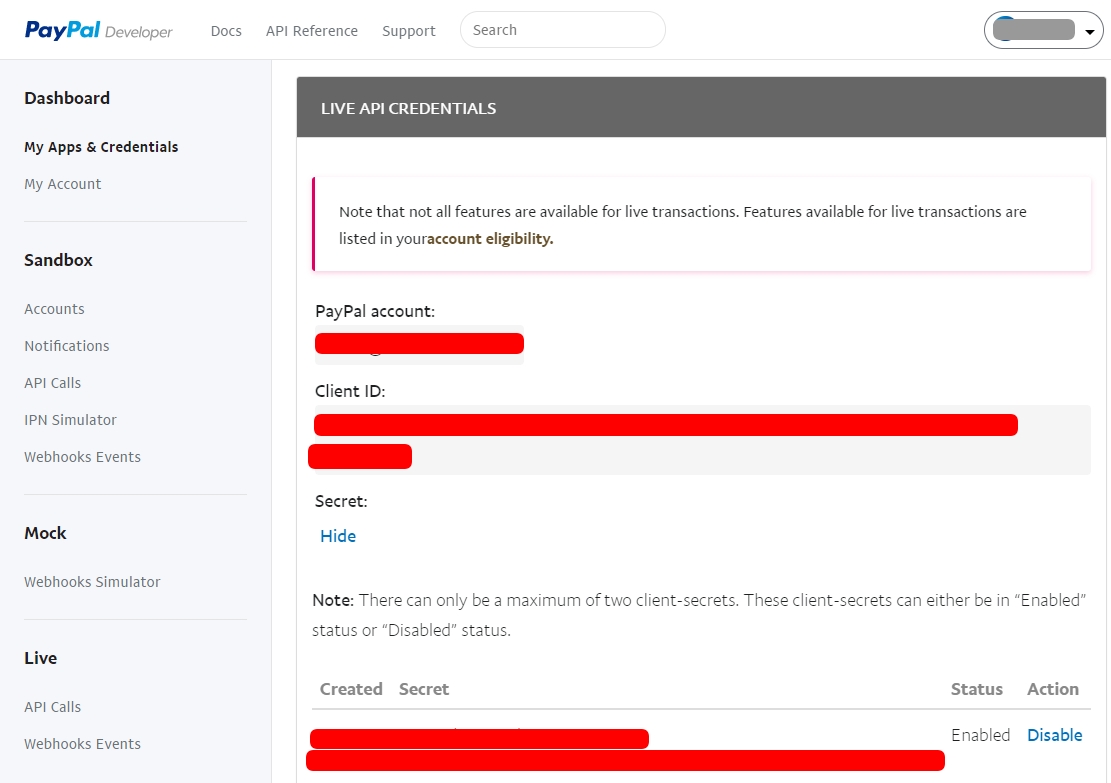 Enable PayPal payments and paste in your "Client ID" and "Secret" key from the PayPal dashboard